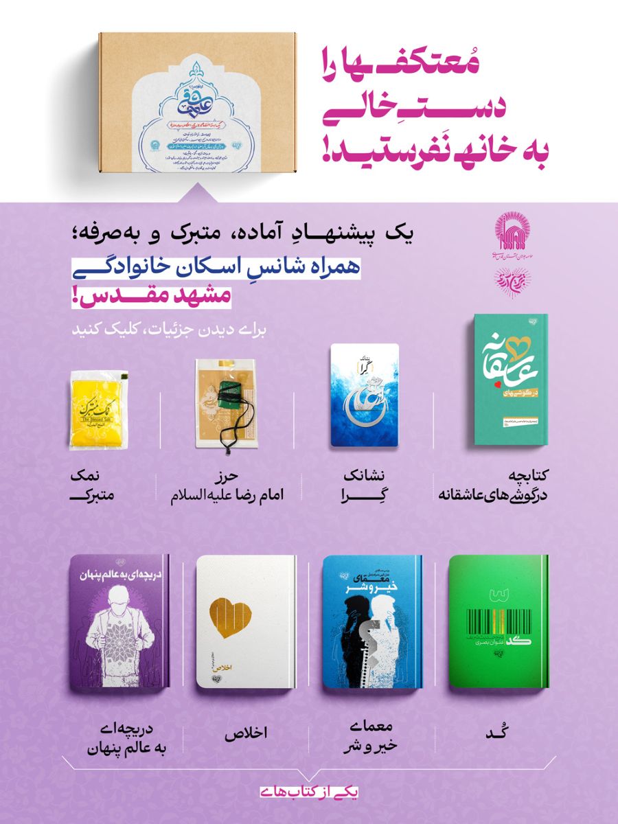 موسسه جوانان آستان قدس رضوی، امسال هم با حمایت ویژۀ آستان، دغدغۀ تمام مدیران و برگزارکنندگان اعتکاف را برای تهیۀ هدیۀ فرهنگی مخاطبان، حل کرده است. این بستۀ خوشقیمت، یک توشهٔ راه است: کتابی برای اندیشیدن، هدیهای کاربردی و پرمعنا، و سوغاتی متبرک برای پیوند دل با امام رئوف؛ یک ترکیب برنده که به گواه معتکفانِ سالهای گذشته، میتواند راهنما و یاورِ غنیتر کردنِ روزهای اعتکاف و سبک زندگیِ تازۀ بعد از اعتکاف باشد.